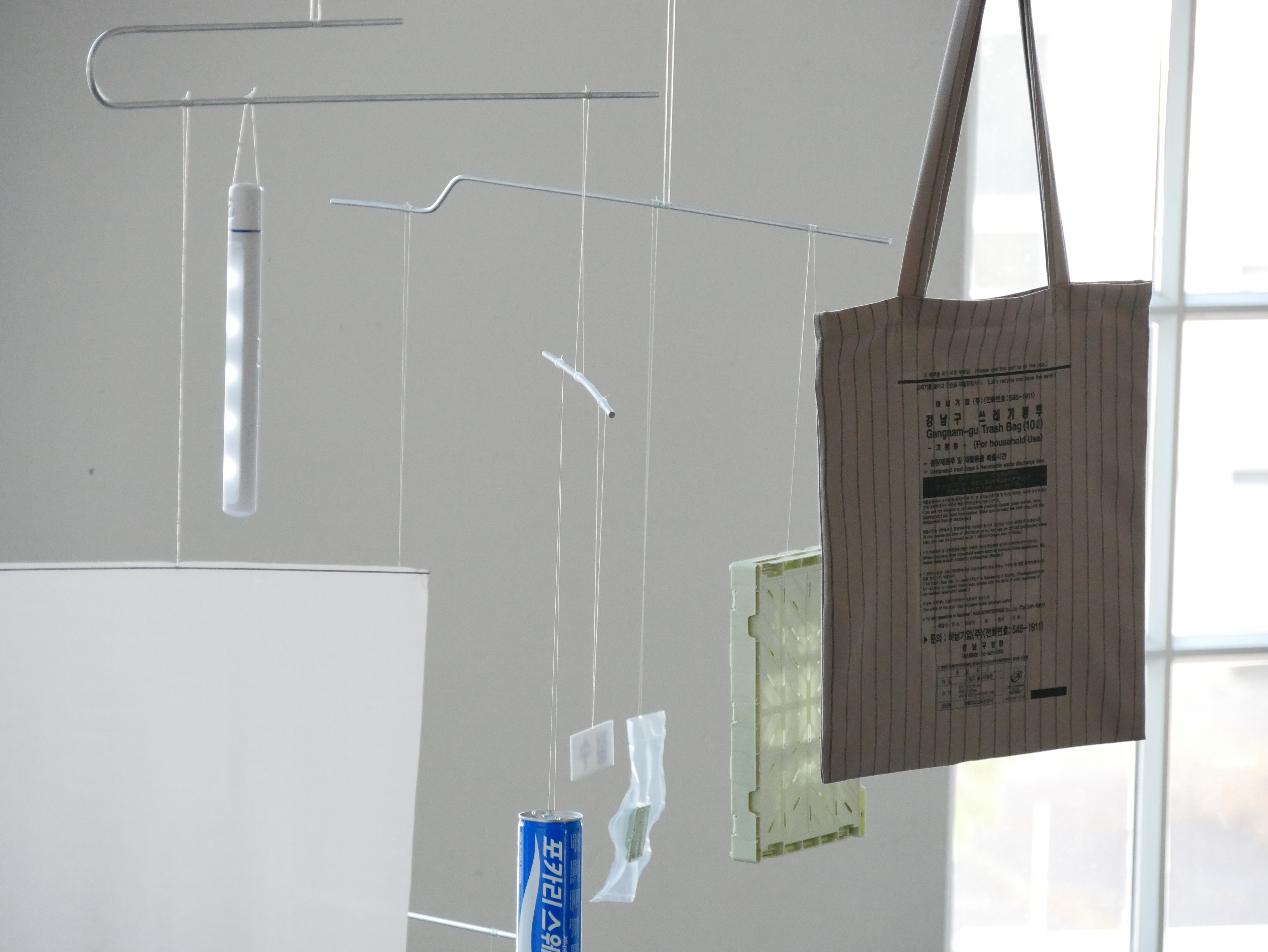 2018// INSTALLATION. 서울특별시 BALANCE captures the minimalist character of the vibrant city of Seoul. The fast moving, ever-changing constellations and formations of the sleepless city are symbolically visualised by using the mobile as a medium. Impressions as well as collected objects and colours are presented in certain thematic areas that are characteristic for the city – such as work-life balance, 24/7, beauty, identity, electrosmog, material cycles – and are finally balanced as a unit. As an integrated part of the installation, the observer creates an airflow with his presence, which sets the mobile in motion. Thus the unobtrusive balancing act invites to pause and focus for a moment.